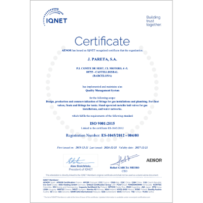 ER-1045/2012 IQNET, Association espagnole de normalisation et de certification atteste que PARETA, SA dispose d’un système de gestion de la qualité conformément à la norme UNE-EN ISO 9001: 2015